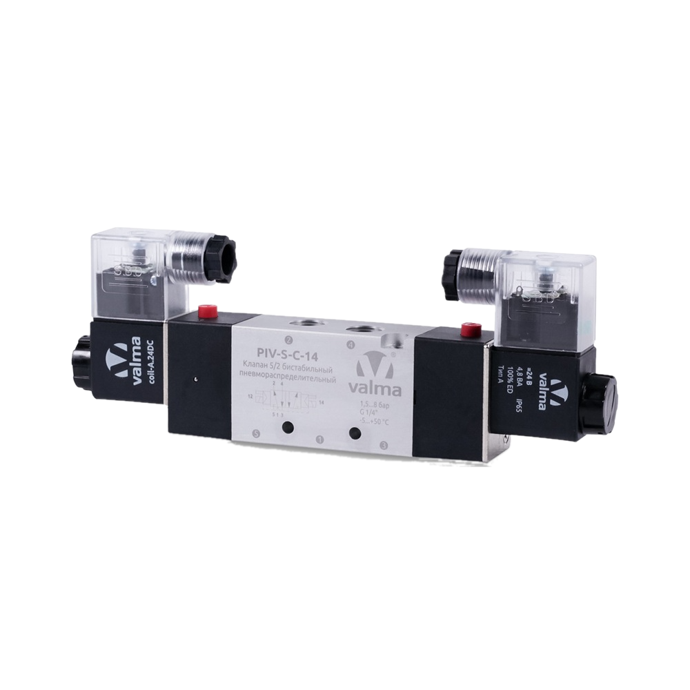 Электромагнитные пневмораспределительные пилотные клапаны VALMA серии PIV-S-C предназначены для управления поворотными пневмоприводами, пневмоцилиндрами или другими пневматическими исполнительными механизмами двустороннего действия (без возвратных пружин). Данные пневмораспределители представляют из себя пневматические распределительные клапаны золотникового типа. В отличие от клапанов прямого действия клапаны золотникового типа обладают значительно большей пропускной способностью при сохранении небольшого энергопотребления. Это позволяет использовать клапаны серии PIV-S-C для управления большими пневмоцилиндрами или в тех случаях, когда требуется высокая скорость срабатывания исполнительных механизмов